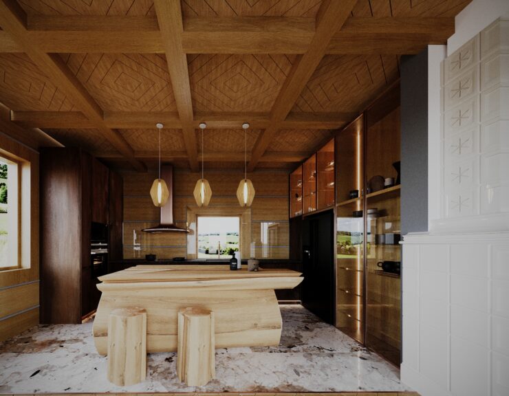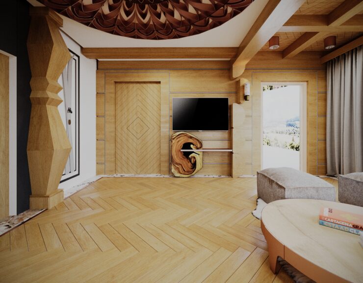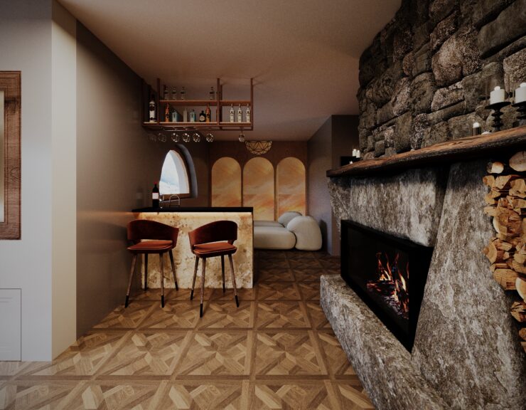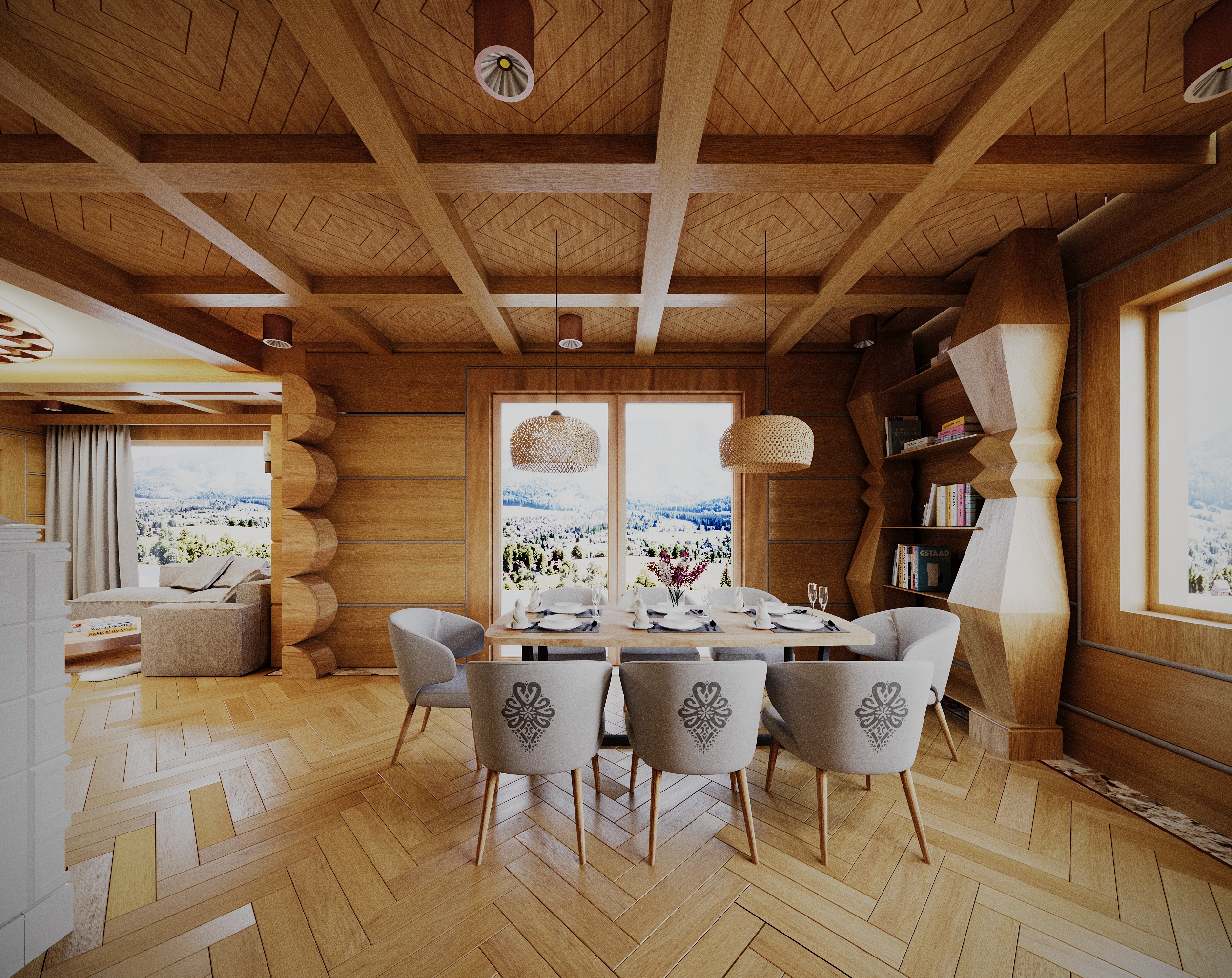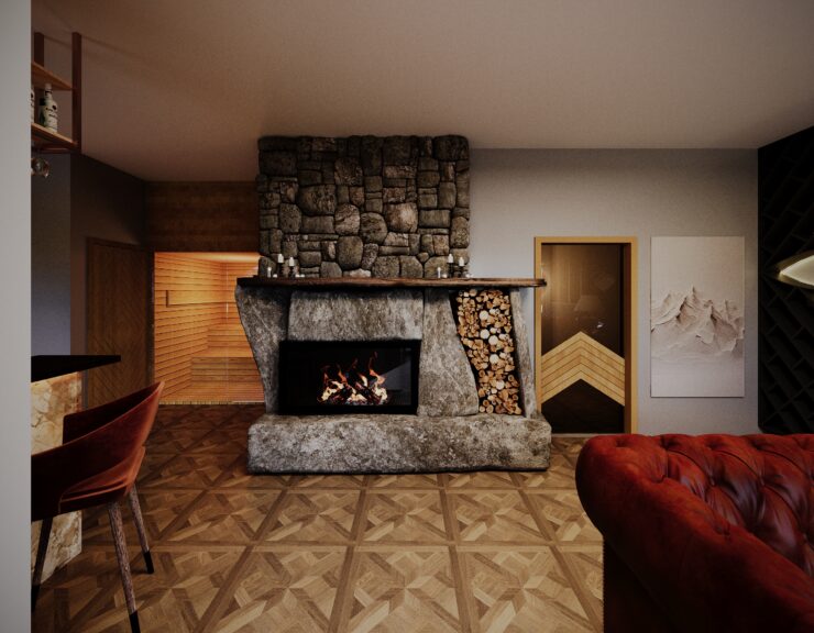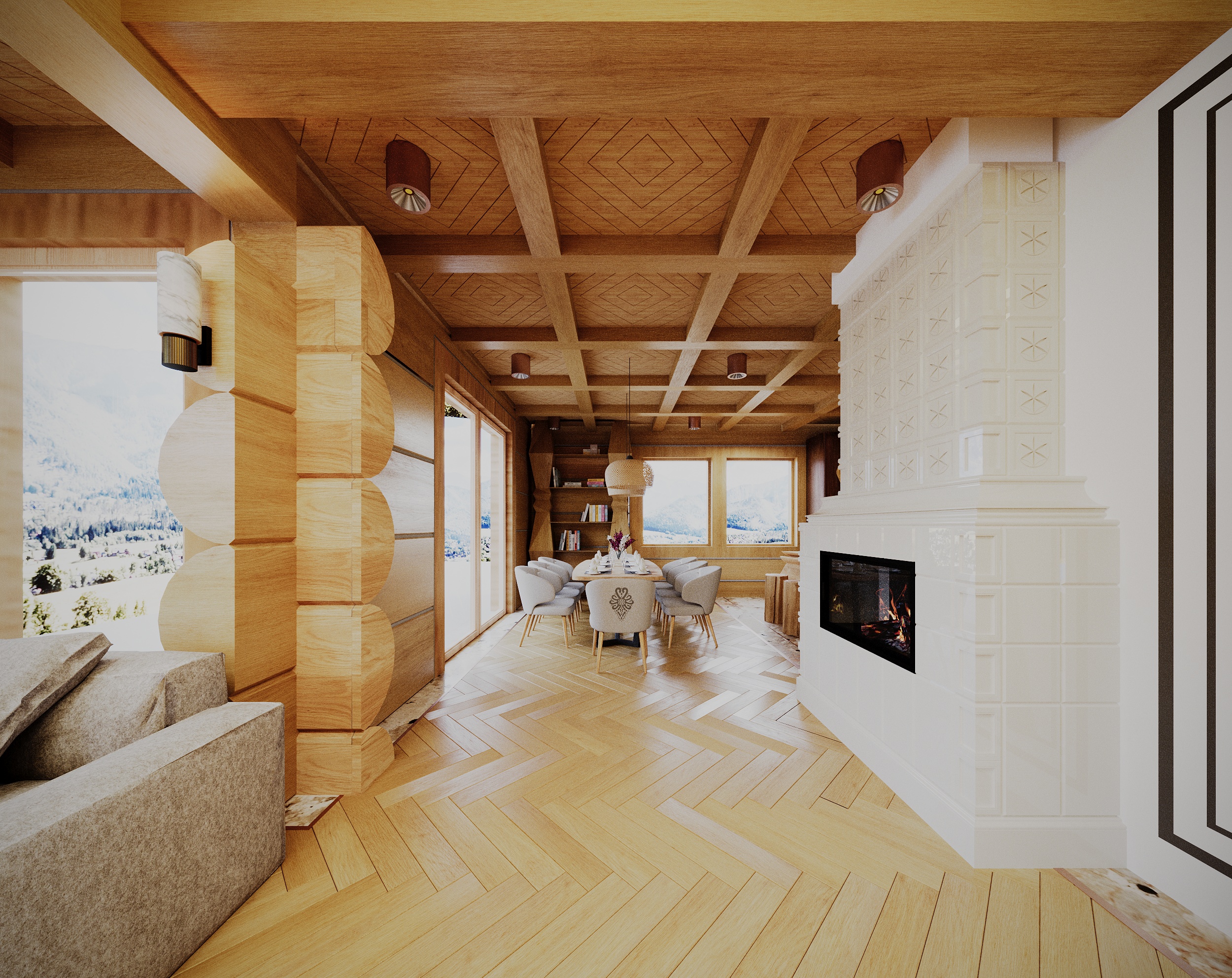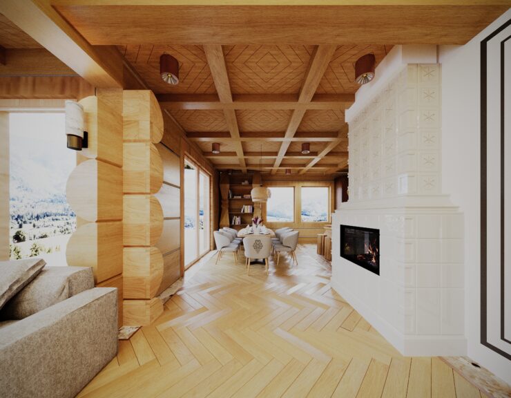 Trzykondygnacyjna bryła obejmuje przyziemie, parter i piętro, a sercem każdej z kondygnacji jest kominek – kamienny w przyziemiu oraz kaflowy na parterze. Detale w postaci drewnianej rozety na suficie i góralskich akcentów nadają wnętrzom autentycznego charakteru, podczas gdy łazienki wykończono eleganckimi włoskimi spiekami.
