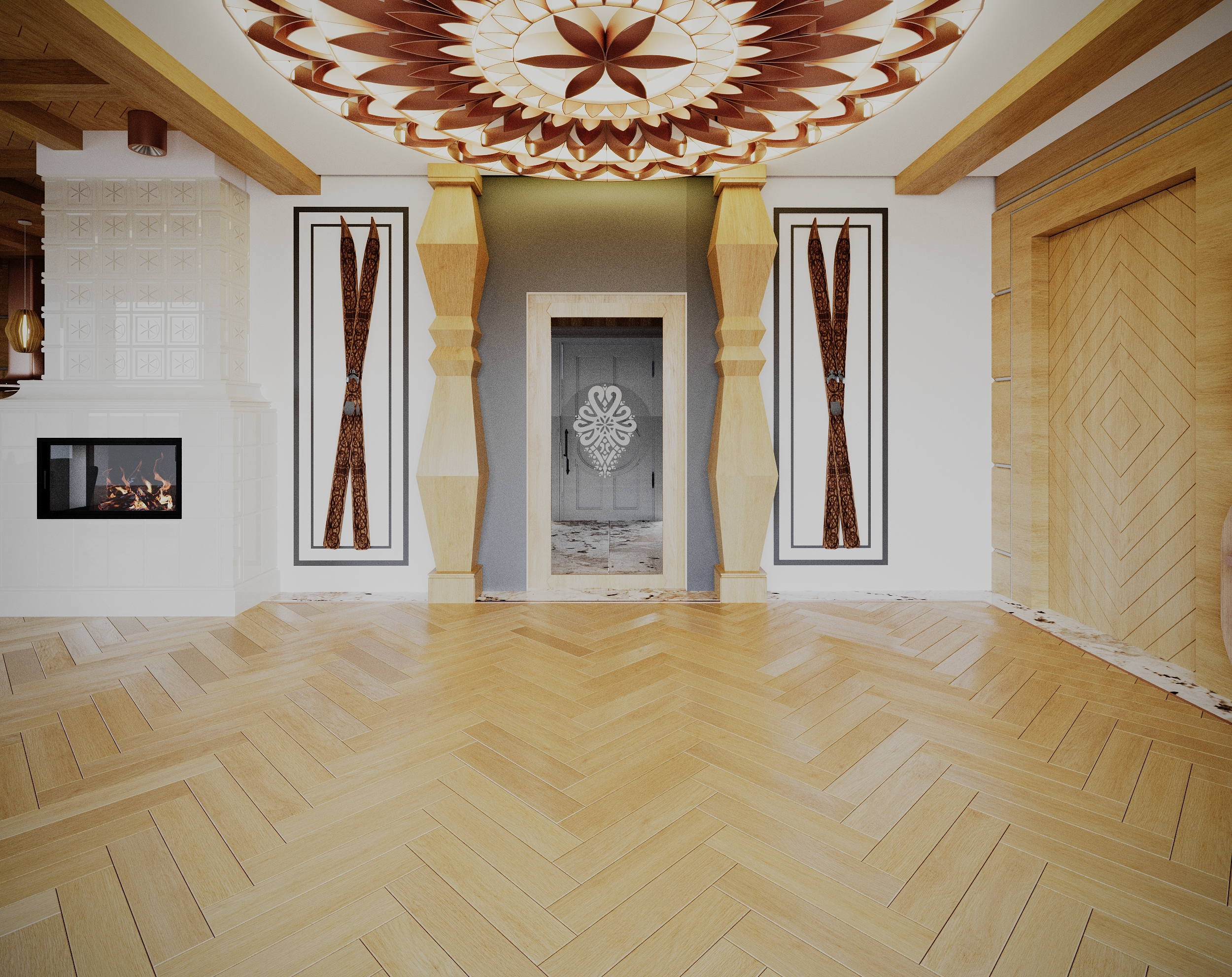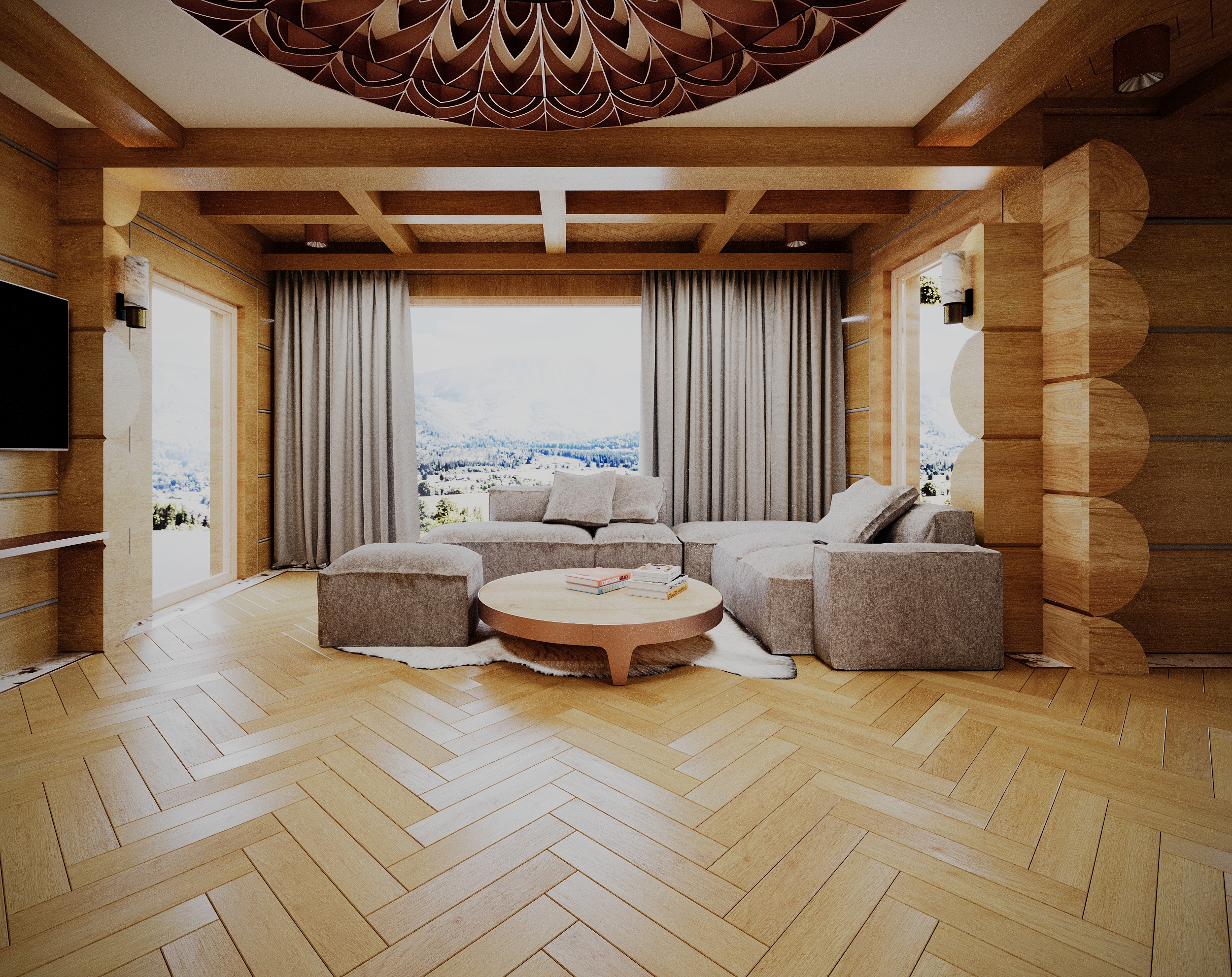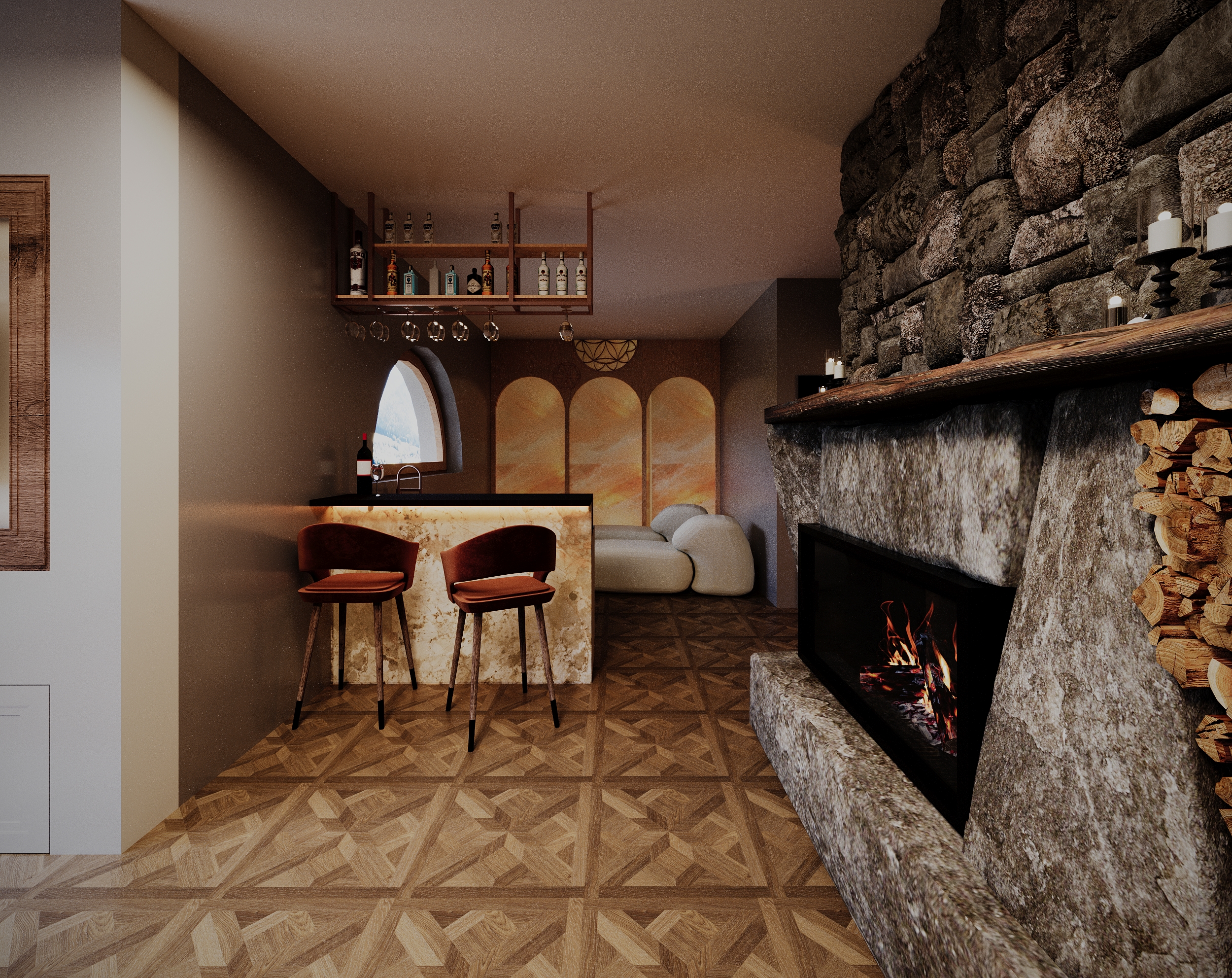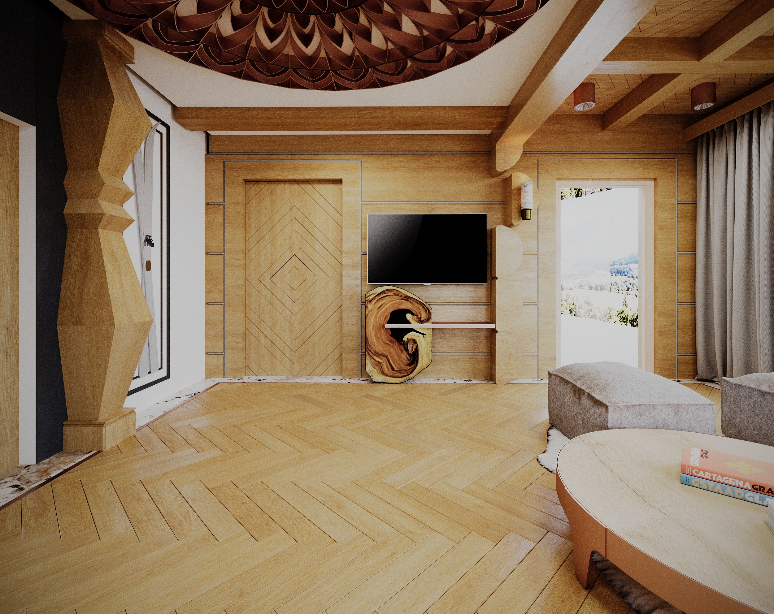 Trzykondygnacyjna bryła obejmuje przyziemie, parter i piętro, a sercem każdej z kondygnacji jest kominek – kamienny w przyziemiu oraz kaflowy na parterze. Detale w postaci drewnianej rozety na suficie i góralskich akcentów nadają wnętrzom autentycznego charakteru, podczas gdy łazienki wykończono eleganckimi włoskimi spiekami.