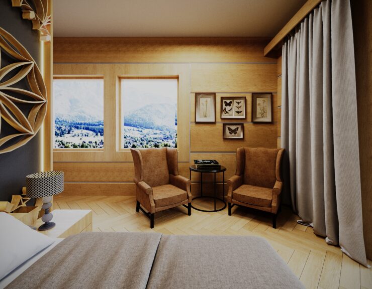 Duże przeszklenia otwierają dom na zapierający dech w piersiach widok Giewontu, podkreślając unikalne połączenie lokalnego dziedzictwa i luksusu.